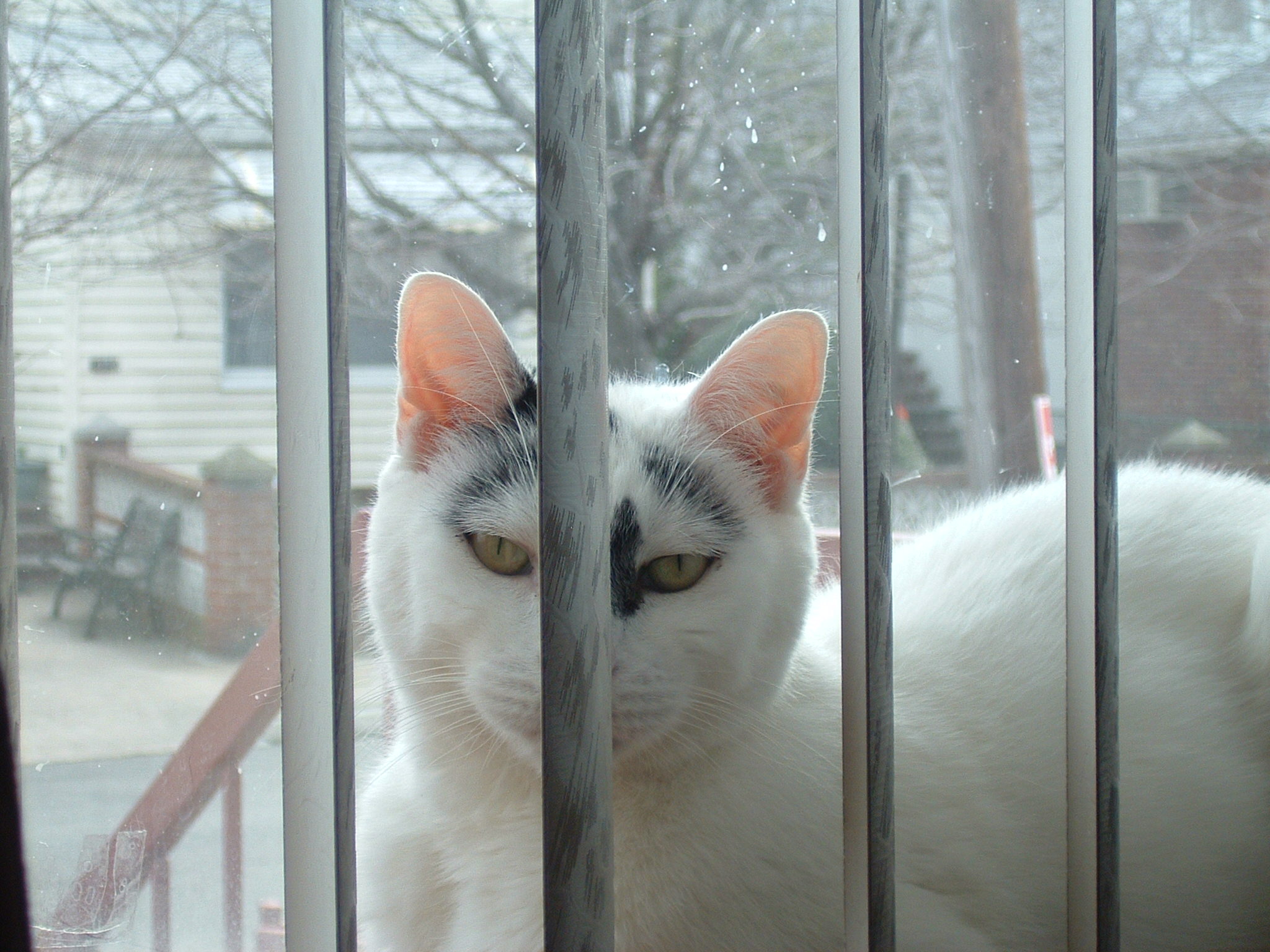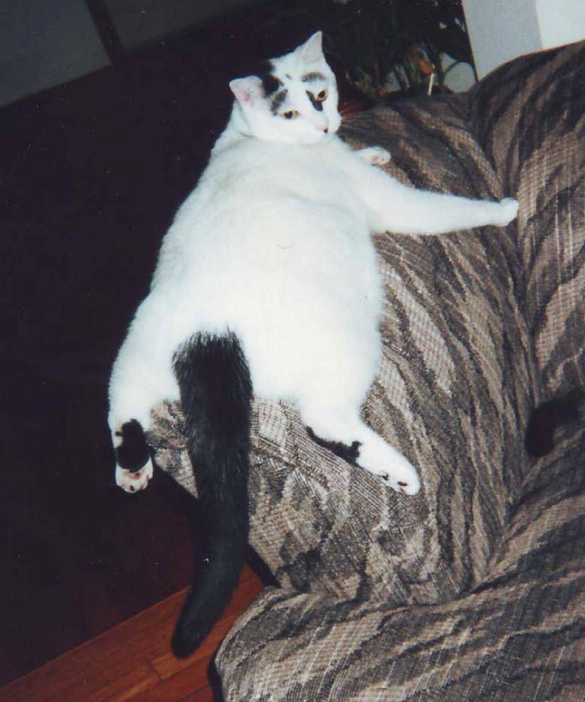 people and loved other cats. Especially kittens. When stray cats came up to my front or back door (both clear-glass storm doors), Fatboy would flop over, wanting to play. One of my fondest memories of him, though, was with kittens. When we (me and my partner at the time) rescued a cat from a nearby alley, she turned out to be pregnant. She had 4 kittens—one died the next day, one we gave to a friend’s father, and we got stuck with the other 2. We had intended on keeping only one, but we just couldn’t find a home for the fourth. Anyway, when they were old enough to let around the other 2 adult cats that we already had, Fatboy decided that the kittens were his. He sat on them—protectively, not to hurt them—and simply claimed them. They were his babies.