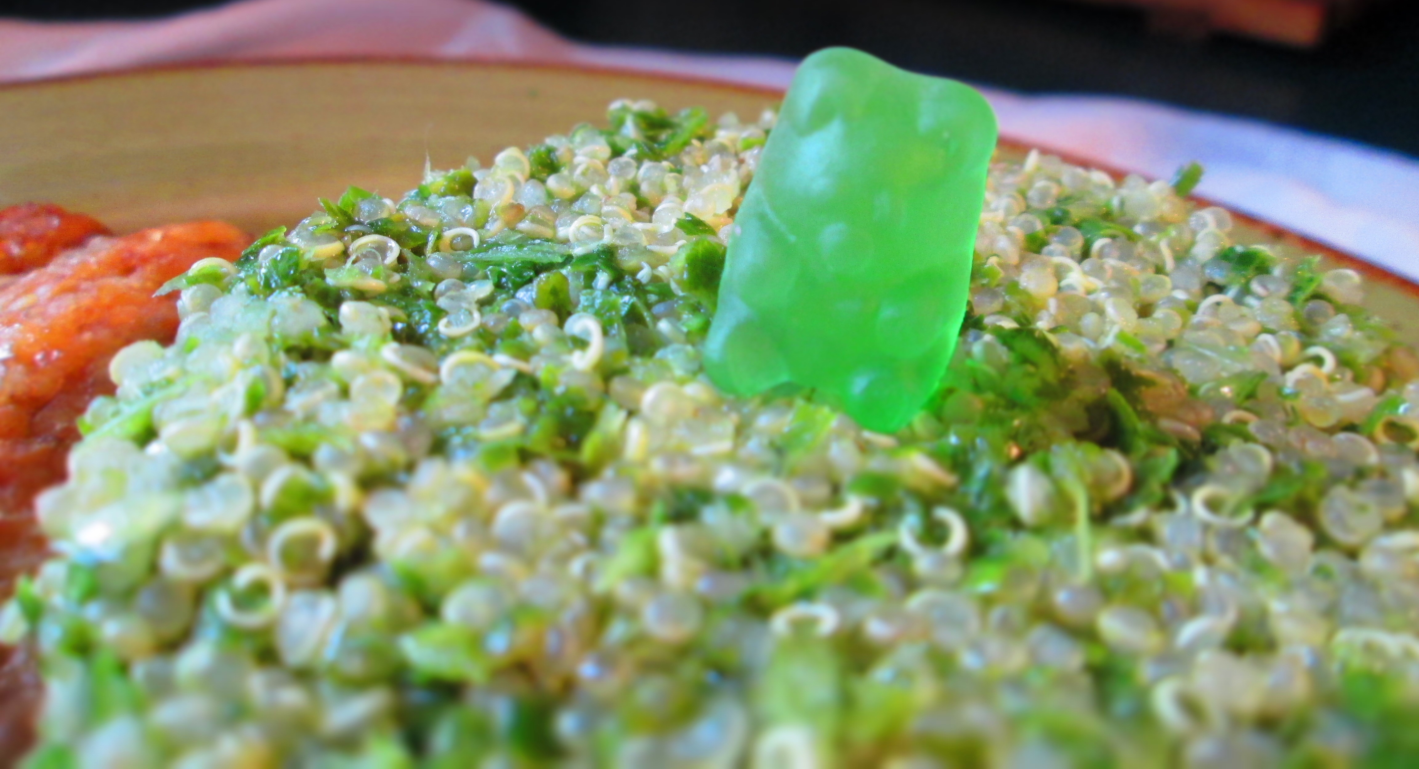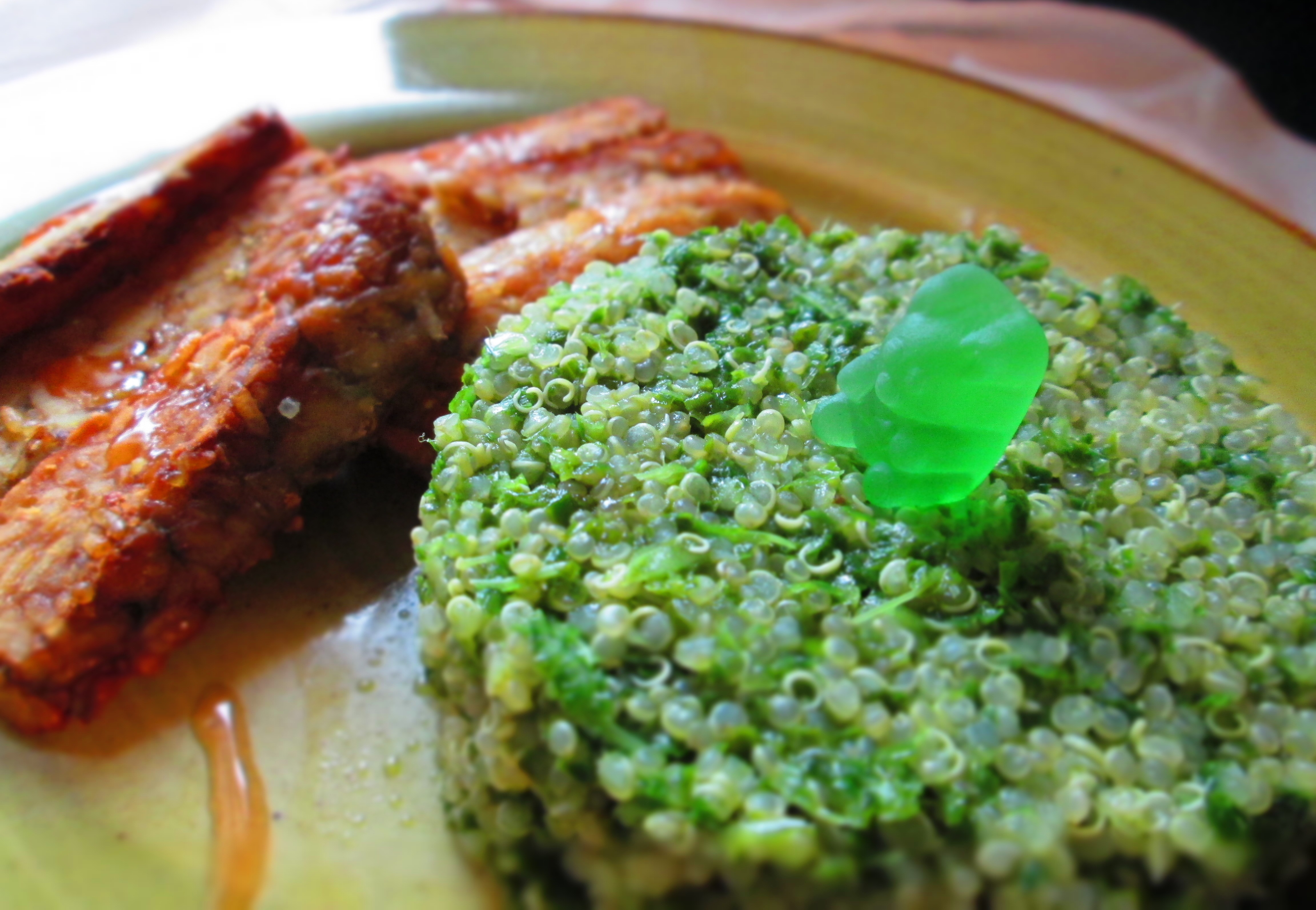 I picked tempeh, kale, and gummie bears. And, per the rules of the game, I used all my ingredients. I came up with Marinated Tempeh, Quinoa with Kale Pesto, and Gummie Bear Gastrique. A gastrique is a sauce that’s made from sugar and vinegar and is then usually flavored with other ingredients. Gummie bear gastrique is intense, so go easy on it. And I would stick to red, orange, yellow, and white (no green or blue, or you’ll get a funny color). And, yes, that’s a little gummie bear sitting on top of the quinoa.